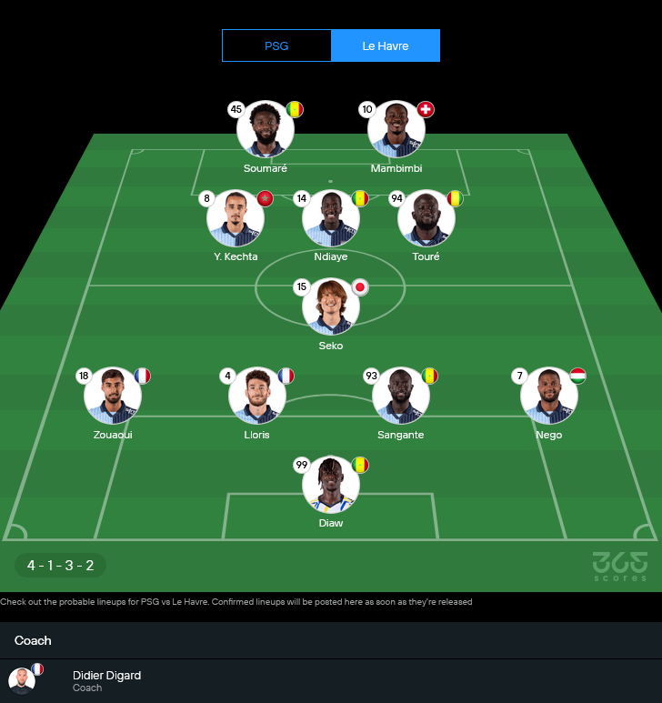 เลอ อาฟร์ ของ ดิดิเยร์ ดิการ์ด์ สภาพทีมไม่ได้เสียเปรียบมาก มีแค่ ดามิอาน ปีซาร์โร่ กับ เอ็มบวาน่า อัลลี ซามัตต้า ที่ยังต้องเช็คฟิต แต่โครงหลักคนอื่นอยู่กันครบ เกมรับนำโดย ชูเลียง ซ็องกานเต้, โกติเย่ร์ ยอริส และแบ็กขวาตัวเก๋าอย่าง โลอิก เนโก้