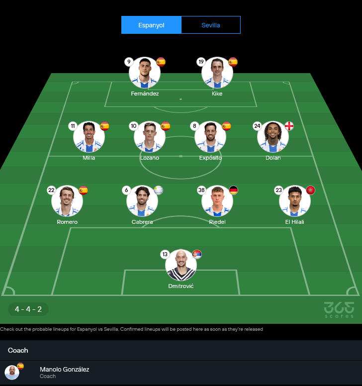 คาดการณ์ 11 ตัวจริง เอสปันญ่อล (4-4-2) พร้อมเรตคะแนนโดย GOALSIAM