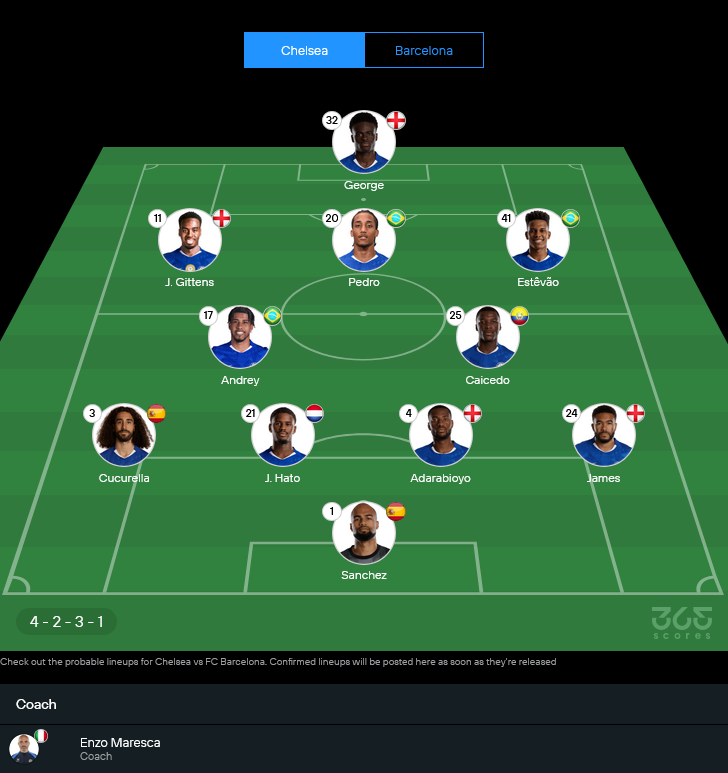 สภาพทีมเจ้าถิ่นมีทั้งข่าวดีและข่าวร้าย ปัญหาหลักอยู่ที่ตัวเจ็บรายสำคัญหลายคน ทั้ง ราฮีม สเตอร์ลิง, กาเบรียล สโลนิน่า, ดาริโอ เอสซูโก้ และ เลวาย โคลวิลล์ ที่ยังเดี้ยงยาว ขณะที่ โรเมโอ ลาเวีย กับ โคล พัลเมอร์ ยังต้องเช็กฟิตจากอาการบาดเจ็บเล็กน้อย ทำให้มาเรสก้าต้องหมุนเวียนตัวใช้งานดาวรุ่งชุดใหม่ในแนวรุก