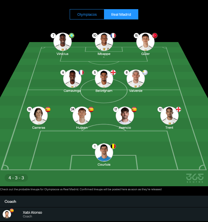 ฝั่งราชันของ ชาบี อลอนโซ่ ปัญหาใหญ่คือแนวรับกับมิดฟิลด์ตัวตัดเกมเจ็บกันเพียบ ตั้งแต่ อันโตนิโอ รือดิเกอร์, เอแดร์ มิลิเตา, ฟรังโก้ มาสตันตูโอโน่, ดานี่ การ์บาฆาล ที่สตาฟฟ์แพทย์เช็กว่าจะไหวไหม รวมถึง ดาวิด อลาบา และ ออเรเลียง ชูอาเมนี ที่ยังอยู่ในกลุ่มเช็กฟิต ทำให้อลอนโซ่ต้องดันแข้งหนุ่มอย่าง ฮูย์เซน กับ การ์เรราส ขึ้นมายืนตัวจริง ขณะที่แผงกลางกับแนวรุกยังจัดเต็มแบบ 4-3-3 ให้ จู๊ด เบลลิงแฮม ขับเกมร่วมกับ คามาวิงก้า และ วัลเวร์เด้ แล้วปล่อย วินิซิอุส, เอ็มบัปเป้, กูแลร์ ลากเลื้อยข้างหน้า