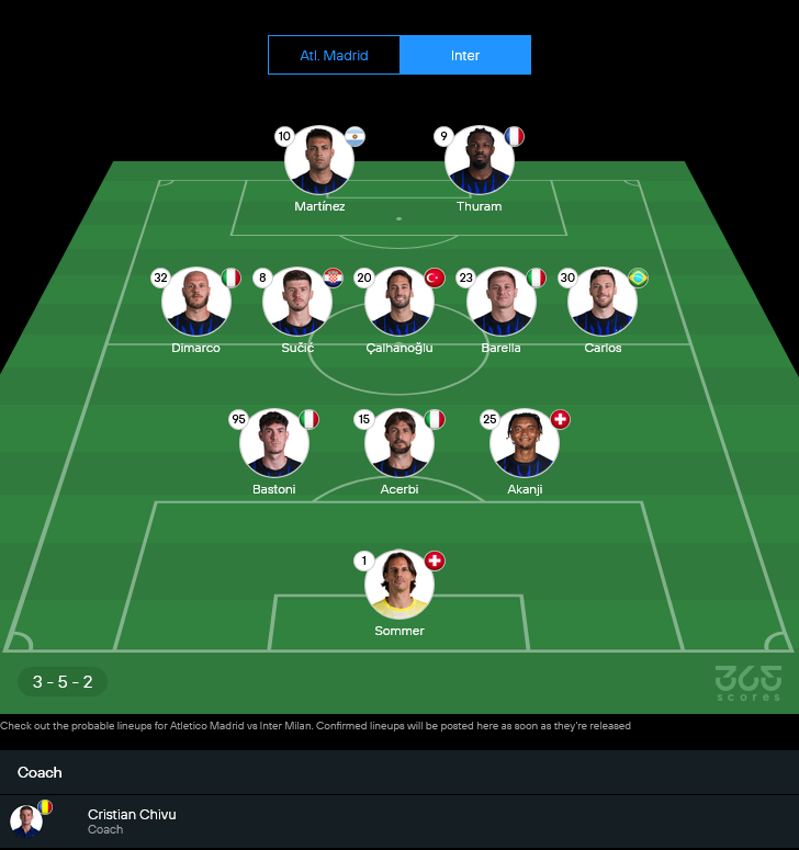 อินเตอร์ของคิวูยังมีปัญหาตัวเจ็บอยู่บ้าง โดยเฉพาะ เฮนริกห์ มคิตาร์ยาน และ มัตเตโอ ดาร์เมียน ที่เดี้ยงยาวแน่นอน ขณะที่ เดนเซล ดุมฟรีส์ ยังอยู่ในกลุ่มเช็กฟิต แต่โครงหลักของทีมยังแน่น ระบบ 3-5-2 ยังเป็นหัวใจสำคัญ เน้นคุมเกมแดนกลางด้วย ฮาคาน ชัลฮาโนลู และ นิโคโล่ บาเรลล่า คอยจ่ายบอลทะลุช่องหา มาร์คุส ตูราม กับ เลาตาโร่ มาร์ติเนซ ที่เคลื่อนที่หาช่องดีมาก