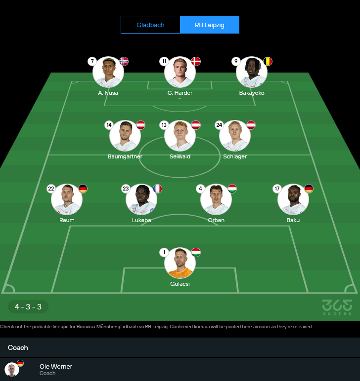 จากแผน 4 3 3 ในภาพล่าสุด ไลป์ซิกวางแบ็กสองฝั่งเป็น ดาวิด รอม กับ ริเดิ้ล บากู คอยเติมเกมริมเส้น เซ็นเตอร์ใช้ วิลลี่ ออร์บาน จับคู่ กาสเตลโล ลูเกบา กลางสามคนให้ นิโคลัส ไซวัลด์ ยืนเชื่อมเกมร่วมกับ คริสตอฟ บอมการ์ตเนอร์ และ ซาแวร์ ชลาเกอร์ ส่วนแนวรุกใช้ความจัดจ้านของ อันโตนิโอ นูซ่า กับ บากาโยโก้ เปิดทางให้หัวหอกหนุ่ม คอนราด ฮาร์เดอร์ รับบทจบสกอร์หลัก
