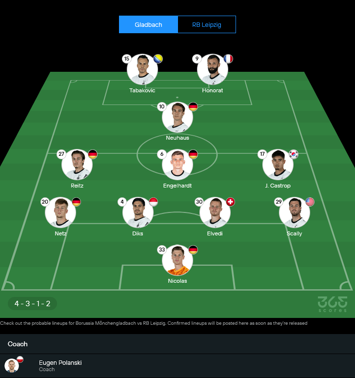 จากภาพไลน์อัพล่าสุด กลัดบัคยืนระบบ 4 3 1 2 เน้นคุมแดนกลางด้วย เอนเจลฮาร์ดต์ เป็นตัวตัดเกม ข้างหน้าใช้ นอยเฮาส์ ยืนฟรีโรลปั้นเกมหลังคู่หน้า ทาบาโควิช กับ โอโนราต์ ที่วิ่งหาช่องและเก็บบอลในกรอบเขตโทษได้ดี