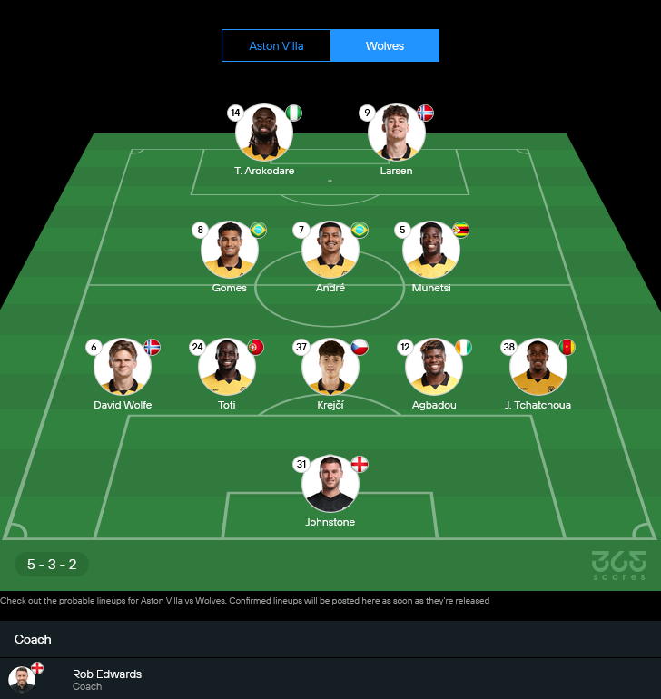 ตามภาพไลน์อัป วูล์ฟส์น่าจะยืนหลัง 5 ใช้ จอห์นสโตน เฝ้าเสา สามเซ็นเตอร์เป็น โตติ, ลาดิสลาฟ เครจชี และ เจโรเม อั๊กบาดู สองวิงแบ็กเป็น เดวิด โวล์ฟ ทางซ้ายกับ ฌอง-ริก โชตชัว ทางขวา แดนกลางสามคนใช้ ชูเอา โกเมส, อันเดร และ มาร์แชล มูเนตซี ส่วนคู่หน้าจัดให้ ทาโย อาโรโกดาเร ยืนล่าตาข่ายกับ ยอร์เกน สแตรนด์ ลาร์เซน