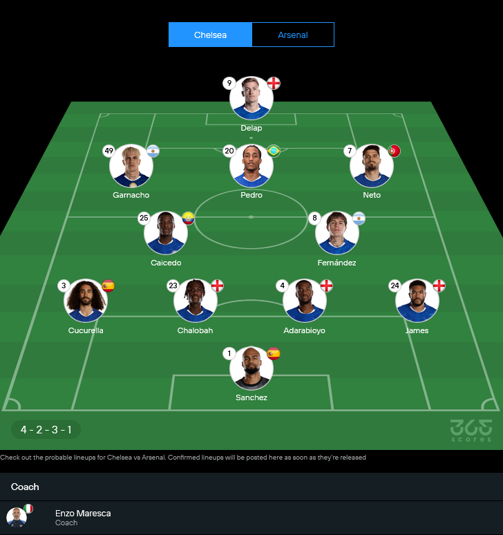 เชลซีของมาเรสก้าต้องขาดกำลังหลักหลายคน ราฮีม สเตอร์ลิง, ดาริโอ เอสซูโก้, เลวี โคลวิลล์ และ โรมิโอ ลาเวีย ยังเจ็บ ส่วนมิคไฮโล มูดริกติดโทษแบน แต่ข่าวดีคือโครงหลักที่ลงบาร์เซโลนายังฟิตครบ แผนที่ใช้ต่อเนื่องคือ 4-2-3-1 เน้นครองบอล แล้วค่อยเร่งสปีดเกมริมเส้น