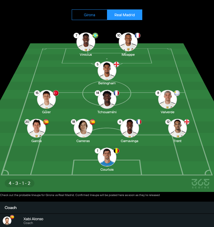 อย่างไรก็ดี แกนหลักแนวรุกทั้ง จู๊ด เบลลิงแฮม, คิลิยัน เอ็มบัปเป้ และ วินิซิอุส จูเนียร์ พร้อมลุยครบ อลอนโซน่าจะใช้แผน 4-3-1-2 เน้นคุมกลางแล้วปล่อยสามแนวรุกฝ่าแนวรับเจ้าถิ่น