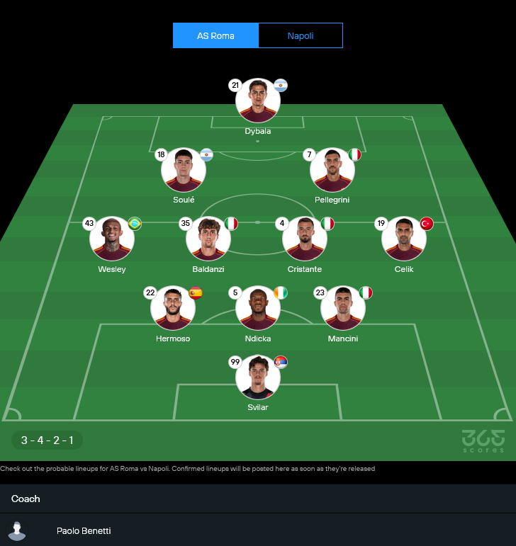 โรม่าในมือกาสเปรินี่ยังมีปัญหาตัวเจ็บยาวอยู่พอสมควร ทั้ง อาร์เต็ม ดอฟบิค หอกเป้าร่างยักษ์, ฟูลแบ็กจอมบุก อันเคลินโญ และกองกลาง เอโดอาร์โด้ โบเว่ ยังเดี้ยงต่อเนื่อง แถมต้องเช็กฟิต ลอเรนโซ่ เปลเลกรินี่ อีกราย แต่ภาพรวมยังพอหมุนเวียนได้แบบไม่เสียทรง แท็คติกหลักคาดว่าจะยืนระบบ 3-4-2-1 เหมือนในภาพไลน์อัปจาก Sofascore ใช้พลังหนุ่มผสมประสบการณ์เล่นงานนาโปลี