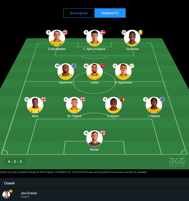 ฝั่ง วัตฟอร์ด ของ ฆาบี กราเซีย ตัวเจ็บค้างสต๊อกมีหลายรายเหมือนกัน แจ็ค กรีฟส์, ควัดโว่ บาห์, อีกิล เซลวิค และ คาเล็บ ไวลี่ย์ ยังไม่พร้อมทั้งหมด แต่โครงหลักที่ลงเล่นสม่ำเสมอยังอยู่กันครบ ปรับมาใช้แผน 4-3-3 เน้นสปีดริมเส้นและการสลับวิ่งทำทางจากแดนกลาง
