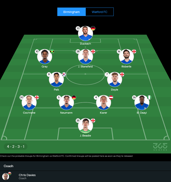 11 ตัวจริงคาดการณ์ เบอร์มิงแฮม (4-2-3-1)