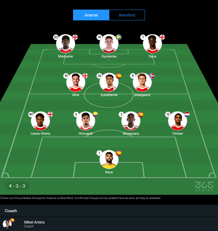 ฝั่งเจ้าบ้านของมิเกล อาร์เตต้า มีปัญหาตัวเจ็บอยู่บ้าง แต่ตัวหลักที่ฟอร์มจัด ๆ ยังอยู่ครบ ทั้ง บูกาโย่ ซาก้า วิคตอร์ ย็อคเคเรส และมิดฟิลด์แม่ทัพอย่าง ดีแคลน ไรซ์ ขาดเพียง ไค ฮาแวร์ตซ์, เลอันโดร ทรอสซาร์, กาเบรียล มากัลเญส และ วิลเลียม ซาลิบา ที่เดี้ยงอยู่ก่อนแล้ว