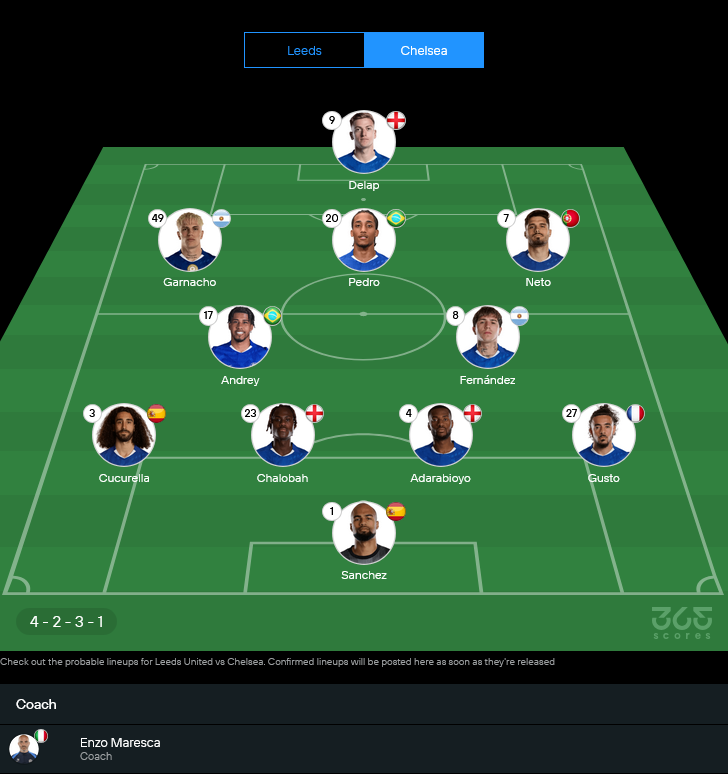 ระบบที่มาเรสก้าน่าจะใช้คือ 4-2-3-1 เน้นครองบอลไฮเทคนิค แดนกลางมี อันเดรย์ กับ เอ็นโซ่ เฟร์นันเดซ ปั้นเกม ข้างหน้าส่ง เปโดร เป็นหน้าต่ำ เชื่อมบอลให้ปีกอย่าง การ์นาโช่ กับ เปโดร เนโต้ สนับสนุน เดลาป หน้าเป้าตัวชนในกรอบเขตโทษ