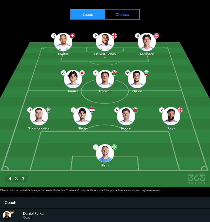 ลีดส์ของ ดาเนียล ฟาร์เก้ เจอปัญหาขุมกำลังพอสมควร ตัวหลักเดี้ยงเพียบทั้ง ฌอน ลองสตาฟฟ์, อันตอน ชตาช, เซบัสเตียน บอร์เนา และ แดเนียล เจมส์ ที่จากภาพข้อมูลล่าสุดยังขึ้นสถานะ Out อยู่หลายราย ทำให้ตัวเลือกในแดนกลางและเกมรับบางลงพอสมควร แต่ยังดีที่แกนหลักอย่าง อีธาน แอมปาดู กับ อาโอะ ทานากะ พร้อมเป็นหัวใจกลางสนาม