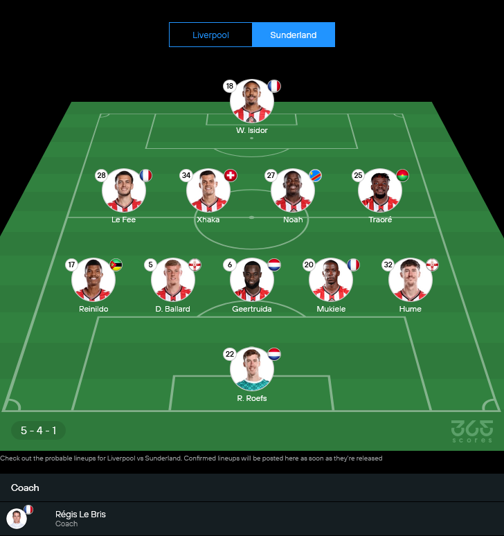 ฝั่งซันเดอร์แลนด์ของเรกิส เลอ บริส์ มีปัญหาตัวเจ็บเยอะพอสมควร ทั้งเดนนิส เซอร์กิ้น, เลโอ ฟูห์ร์ เฮียลดือ, โรเมน มันเดิล, อายิโบลา-โจชัว อาเลเซ่ และ ฮาบิบ ดิยาร์ร่า เข้าโรงหมอพร้อมกัน แต่โครงหลักเกมรุกยังอยู่ครบ นำโดย วิลสัน อิซิดอร์ ที่เพิ่งสอยประตูสำคัญในเกมกับบอร์นมัธ