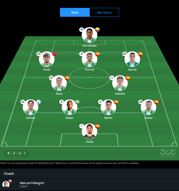ฝั่งเจ้าถิ่นของกุนซือ มานูเอล เปเยกรินี มีข่าวไม่ค่อยดีเรื่องตัวเจ็บพอสมควร ทั้ง เฮคตอร์ เบเยริน กับ อิสโก้ ต้องนั่งดูเพื่อนยาว ขณะที่ โจวานี่ โล เซลโซ่ กับ โซฟิยาน อัมราบัต ยังเช็คฟิต แต่ภาพรวมชุดหลักยังอยู่กันพร้อม หน้าเสาธงคือระบบ 4-2-3-1 เล่นดุดันในบ้าน เน้นต่อบอลไหลลื่นก่อนแทงทะลุช่องให้หอกโคลอมเบียอย่าง คูโช่ เอร์นานเดซ จบสกอร์
