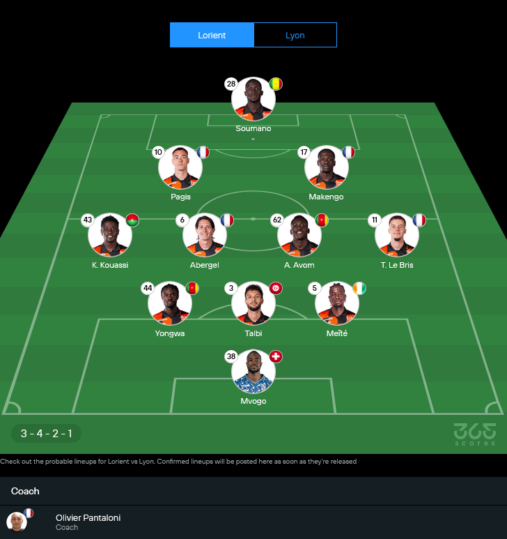 ลอริยองต์ภายใต้การคุมทีมของ โอลิวิเยร์ ป็องตาลอนี ยืนระบบ 3-4-2-1 เป็นหลัก เน้นเกมเพรสซิ่งกลางสนามและสปีดริมเส้น เกมนี้ยังต้องเช็กฟิตแนวรับอย่าง บาโม เมอิเต้ ที่เจ็บเล็กน้อยจากเกมชนะนีซ ส่วนรายที่เดี้ยงอยู่แล้วมี ทรีแวน ซานูซี, อับดูลาย ฟาย, ซูเลย์มาน ตูเร่ ขณะที่ ปานอส แคตเซริส และ บันดิโอกู ฟาดิก้า ยังติดโหมดเช็กความฟิต แต่โดยรวมยังจัดตัวหลักลงครบ ทำให้มุมมองเชิง วิเคราะห์บอล ฝั่งเจ้าบ้านถือว่ายังสู้ได้สนุกแน่นอน