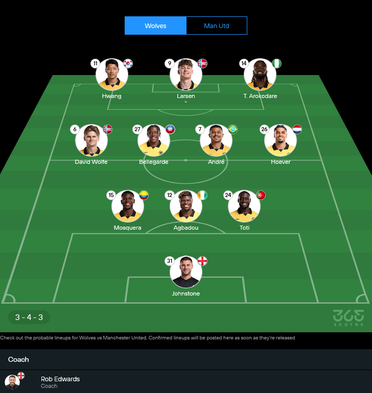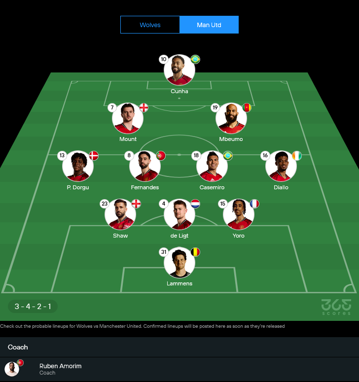 ฝั่งทีมเยือนของรูเบน อาโมริม ข่าวดีคือโครงหลักพร้อมลุย แผงหลังสามมี ลุค ชอว์, มัตไตย์ส เดอ ลิกต์ และ เลนี่ โยโร่ ยืนดักหน้า เซนเน่ ลัมเมนส์ ผู้รักษาประตูดาวรุ่งที่ได้โอกาสต่อเนื่อง ตัวที่หายหน้าไปคือ แฮร์รี่ แม็กไกวร์ กับ เบนยามิน เชสโก้ ซึ่งยังเดี้ยงยาว ทำให้ตัวเลือกเซ็นเตอร์และหน้าเป้าเหลือน้อยลงเล็กน้อย