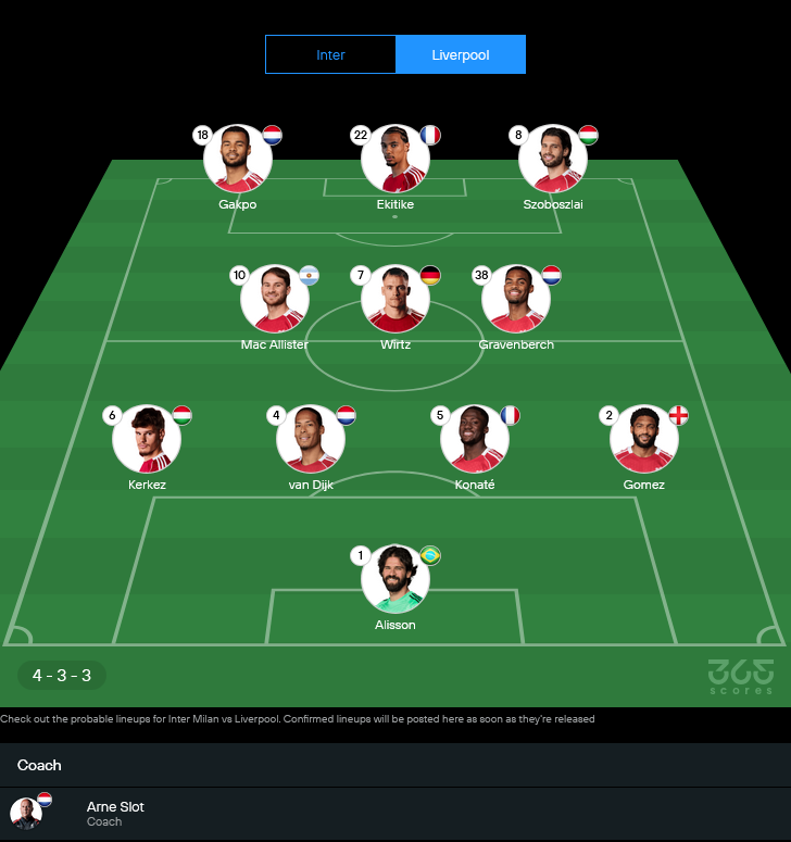 แดนกลางสามตัวใช้ ไรอัน กราเฟนแบร์ก, อเล็กซิส แม็ค อัลลิสเตอร์ และ ฟลอเรียน เวียร์ตซ์ ที่ยืนเป็นตัวเชื่อมเกมระหว่างกลางกับหน้า ข้างบนเป็นสามประสาน โคดี้ กักโป, ฮูโก้ อิกิติเก้ และ โดมินิค โซบอสซ์ไล ขณะที่ โมฮาเหม็ด ซาลาห์ มีโอกาสนั่งสำรองต่อเนื่องหลังมีประเด็นนอกสนาม