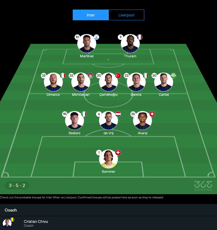 แผงหลังสามคนน่าจะเป็น อเลสซานโดร บาสโตนี่, สเตฟาน เดอ ฟราย และ มานูเอล อาคานจี ยานน์ ซอมเมอร์ ยืนเป็นผู้รักษาประตู แดนกลางใช้ ฮาคาน ชัลฮาโนลู คุมจังหวะร่วมกับ นิโคโล บาเรลล่า และ เฮนริค มคิทาร์ยาน ขณะที่ริมเส้นเป็น เฟเดริโก ดิมาร์โก กับ คาร์ลอส อากุสโต้ คอยเติมเกมรุก เปิดบอลให้คู่หน้าทองคำ เลาตาโร่ มาร์ติเนซ จับคู่ มาร์คุส ตูราม