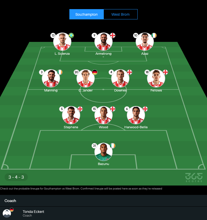จากภาพไลน์อัพล่าสุด เซาท์แฮมป์ตันของกุนซือ Tonda Eckert ยังยึดระบบ 3-4-3 เน้นเกมรุกริมเส้นและการสอดขึ้นมายิงของตัวรุกด้านใน สภาพทีมยังต้องเช็กฟิต อดัม อาร์มสตรอง ดาวยิงตัวหลัก แต่ในรูปชุดคาดการณ์ยังยืนหน้าเป้าอยู่ ถ้าไม่พร้อมจริงค่อยปรับหน้างาน ส่วนตำแหน่งอื่นๆ ถือว่าพร้อมบู๊ แผงหลังสามคนอย่าง สตีเฟนส์, วูด และ ฮาร์วูด เบลลิส ทำงานร่วมกันได้ดี ข้างหน้ามี แมนิ่ง กับ เฟลโลวส์ เติมจากวิงแบ็กช่วยเกมรุก