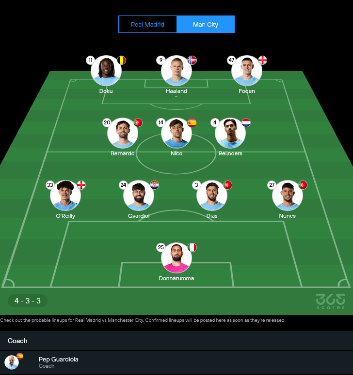 ซิตี้กำลังไหลในลีก ชนะ 3 เกมติด ยิงรวม 11 ลูก ฟอร์มเกมรุกอย่างกับเปิดโหมดง่าย ยิงได้ทุกทิศทั้งจาก ฮาแลนด์ ที่จบคมเหมือนเดิม และตัวริมเส้นอย่าง โฟเด้น กับ โดกู ที่พร้อมฉีกแนวรับคู่แข่งตลอดเวลา แต่จุดที่ต้องติคือเกมรับนอกบ้าน พลาดง่ายเสียไป 6 ลูกในสองทริปล่าสุด ทำให้มาเยือนเบร์นาเบวคราวนี้มีเรื่องให้กังวลอยู่ไม่น้อย
