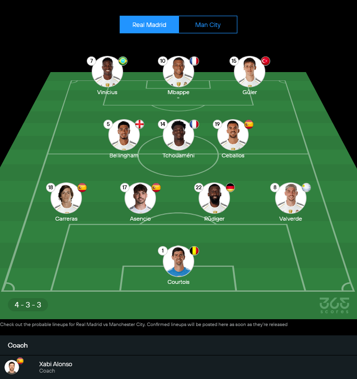 ราชันยังมีปัญหาหนักที่แผงหลัง ตัวหลักเดี้ยงยาวเพียบ ทั้ง เอแดร์ มิลิเตา, ดาเนียล การ์บาฆาล, แฟร์กล็องด์ เมนดี้, เทรนต์ อเล็กซานเดอร์ อาร์โนลด์ และ เอดูอาร์โด้ กามาวิงก้า ขณะที่ ดีน ฮุยเซน กับ ดาวิด อลาบา ยังต้องเช็กฟิต ทำให้ ชาบี อลอนโซ่ ต้องโยกใช้บรรดาตัวสารพัดประโยชน์มาช่วยแนวรับ แต่ข้อดีคือโซนกลางและแนวรุกอยู่กันครบ ฟิตพร้อมบู๊เต็มที่ แท็กติกน่าจะมาในระบบ 4 3 3 ใช้การเชื่อมเกมสั้นตรงกลาง ก่อนปล่อยให้สตาร์ในแดนหน้าเล่นงานแนวรับซิตี้แบบตัวต่อตัว ฟีลสายดูบอลต้องบอกว่านี่คือคู่ที่เอาไว้จดโน้ตเรื่องจังหวะ วิเคราะห์บอล ได้เลย