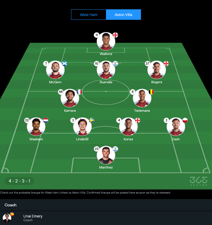 ฝั่งของ อูไน เอเมรี่ ได้เปรียบเรื่องขุมกำลังพอสมควร มีแค่ ไทโรน มิงส์ กับ รอสส์ บาร์คลี่ย์ ที่ยังเดี้ยงยาว ที่เหลือฟิตพร้อมบู๊ แผนหลักคือ 4-2-3-1 เน้นครองบอลกดดันคู่แข่ง มีคู่กลางอย่างกามาร่า–ตีเลอม็องส์ คอยคุมจังหวะ ริมเส้นใช้ แม็กกินน์ กับ โรเจอร์ส ป้อนบอลให้วัตกิ้นส์ในกรอบเขตโทษ