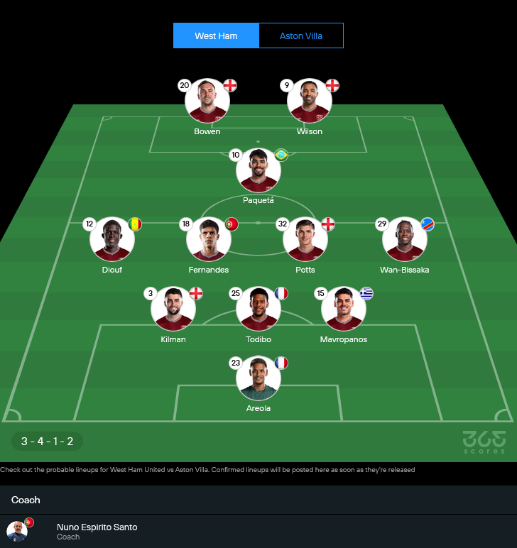 ลูกทีมของ นูโน่ เอสปิริโต้ ซานโต มีข่าวดีคือไม่มีแข้งแบนเพิ่ม แต่ยังต้องเช็กฟิต โอลิเวอร์ สคาร์เลส ส่วนมือเก๋าอย่างฟาเบียนสกี้ยังเจ็บยาว ทำให้ อัลฟอนเซ่ อาเรโอล่า ยึดมือหนึ่งยาว ๆ ระบบที่น่าจะใช้ยังเป็น 3-4-1-2 เน้นวิงแบ็กเติมสูงให้เกมริมเส้นหวังลุ้นลูกครอสเข้าใส่แนวรับวิลล่า