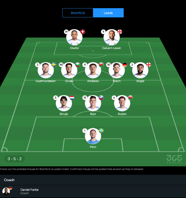 ดาเนี่ยล ฟาร์เค่ มีปัญหาตัวเจ็บพอสมควร แดเนี่ยล เจมส์, ลูคัส เมช่า และ ฌอน ลองสตาฟฟ์ หมดสิทธิ์ลงช่วยทีม แต่ตัวหลักที่เหลือยังพอโรเตชั่นได้ในระบบ 3-5-2 ที่ชอบตั้งโซนกลางแน่นแล้วสวนกลับเร็ว