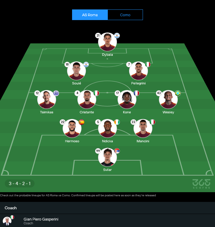 จากภาพจัดทัพ โรม่าน่าจะยึดระบบ 3-4-2-1 เน้นเกมริมเส้นและใช้ตัวรุกเทคนิคจัดจ้านปั่นป่วนแนวรับโคโม่