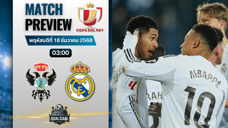 เกมนี้บอกเลยว่าโคตรกลิ่นบอลถ้วย หนึ่งฝั่งคือทีมเล็กจากลีกล่างอย่าง ซีเอฟ ตาลาเบรา เด ลา เรย์นา ที่วิ่งสู้ฟัดในบ้านได้ดุไม่เบา อีกฝั่งคือบิ๊กทีมระดับโลกอย่าง เรอัล มาดริด ที่ขนสตาร์ทั้ง เอ็มบัปเป้, วินิซิอุส, โรดรีโก้, เบลลิงแฮม ลงมาล่าตาข่าย แม้ชื่อชั้นต่างกันลิบ แต่บอลถ้วยสเปนมักมีดราม่าให้ลุ้นตลอด ยิ่งราคาต่อเปิดมาสูงแบบนี้ คนเล่นสายรองกับสายสกอร์ต่ำมีหันมามองกันเยอะแน่นอน ใครกำลังมองหา ทีเด็ดบอล คู่นี้ ต้องนั่งจับเข่าฟัง GOALSIAM เล่าให้จบก่อนค่อยตัดสินใจ เพราะนี่คือเกมที่ทั้งบรรยากาศสนามเล็กและแรงกระหายของฝั่งเจ้าถิ่นจะเข้ามามีผลกับบิลของเราเต็ม ๆ แถม ราคาบอล ดันไหลไปทางราชันชุดขาวแบบจัดหนักอีกต่างหาก