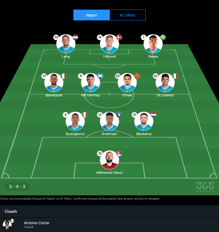 ฝั่งนาโปลี คอนเต้ต้องปวดหัวไม่น้อยเพราะตัวหลักเจ็บยาวเพียบ ทั้ง อเล็กซ์ เมเร็ต, เควิน เดอ บรอยน์, ฟร้องซ์ อองกิสซ่า, บิลลี่ กิลมัวร์ รวมถึง ฮวน เฆซุส และ โรเมลู ลูกากู ที่ยังต้องเช็กฟิต แต่ข่าวดีคือแกนสำคัญอย่าง ฮอยลุนด์, เนเรส, เอลมาส และ แม็คโทมิเนย์ พร้อมลงครบ จึงมีโอกาสเห็นระบบ 3-4-3 ไลน์สูงใส่กันดุๆ ตามสไตล์คอนเต้ที่ชอบเพรสหนักริมเส้น
