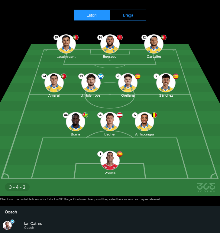 เอสโตริลภายใต้การคุมทีมของเอียน คาโธร สภาพทีมมีปัญหานิดหน่อย ตัวหลักอย่าง เซก้า ยังเจ็บเข่า ส่วน ราฟิค กีต็อง ติดภารกิจทีมชาติ แต่คอร์หลักชุดในภาพไลน์อัพยังอยู่กันครบ แผนที่คาดว่าจะใช้คือ 3-4-3 เน้นแพ็กหลังสาม เติมวิงแบ็กสูงแล้วฝากความหวังไว้กับแนวรุกสามตัวข้างหน้า ถ้าเกมรับไม่รั่วเร็ว มีลุ้นเล่นโต้กลับได้เสียวอยู่