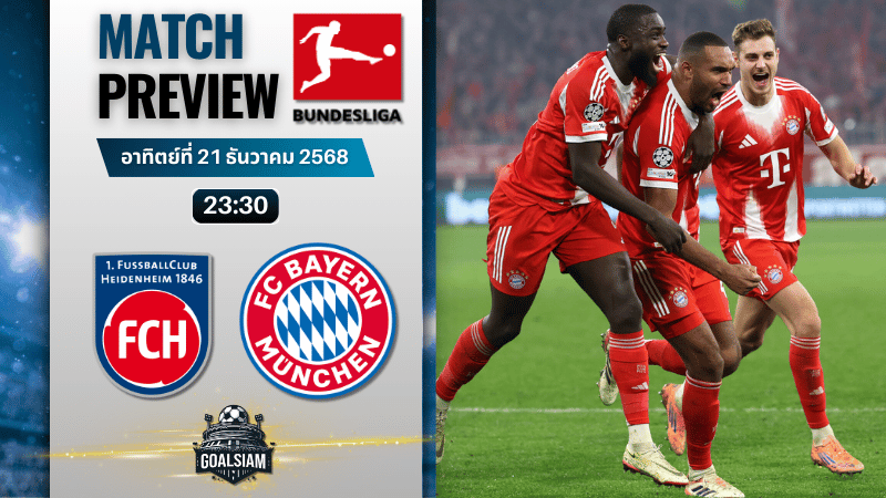 คู่นี้เรียกได้ว่าเป็นบอลคนละชั้นแต่โคตรน่าดู ไฮเดนไฮม์ ทีมโซนล่างที่ใจเกินร้อย เตรียมเปิดวอยธ์ อารีน่า รับการบุกมาของจ่าฝูง บาเยิร์น มิวนิค คืนวันอาทิตย์ที่ 21 ธันวาคม 2568 เวลา 23.30 น. เกมนี้แฟนบอลสายลุยมองกันว่าเป็นหนึ่งในคู่ทำเงินประจำสัปดาห์ เพราะเจอกันทีไรสกอร์ไม่เคยนิ่งต่ำกว่า 3 ลูก แถมรูปเกมยังเปิดหน้าแลกไม่กลัวกันอยู่แล้ว GOALSIAM มองว่าคนที่รอของแรงสำหรับหาแนวทาง ทีเด็ดบอล คืนวันอาทิตย์ ห้ามมองข้ามคู่นี้เด็ดขาด ยิ่งฟอร์มล่าสุดของเสือใต้เพิ่งหลุดเสมอทีมบ๊วย ยิ่งเพิ่มดีกรีความดุเดือดเข้าไปอีกว่าพวกเขาจะมาอัดระบายอารมณ์ใส่ไฮเดนไฮม์หรือไม่