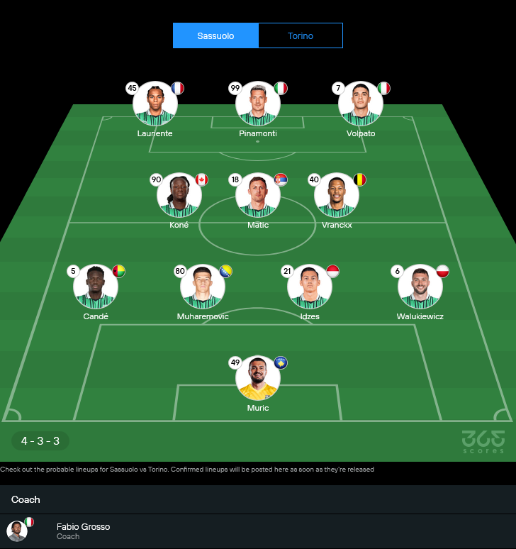 ซัสเซาโล่ของกุนซือกรอสโซ่จะจัดรูปแบบ 4-3-3 ตามถนัด แต่งานนี้สภาพทีมไม่เต็มร้อย เพราะมีตัวเจ็บและโดนแบนเพียบ ธอร์สท์เวดต์ติดโทษแบนจากเกมเสมอมิลาน ส่วนแข้งเดี้ยงยาวมีชื่อคุ้นๆ อย่าง โดเมนิโก้ แบร์ราดี้, เยเฟอร์ซอน ปาซ, สเตฟาโน ทูราติ, ฟิลิปโป โรมาญ่า, ดาเนียล โบโลก้า, เอดูอาร์โด ปิราญโญโล และ เลารุส สเกลเยลรุป ทำให้โค้ชต้องขยับใช้สำรองลงมารับงานเต็มตัว การจัดทีมเลยมีโอกาสเห็น อัสเตอร์ ฟรังคซ์ ลงมายืนคู่กลางกับ มาติช และโกเน่ในเกมนี้