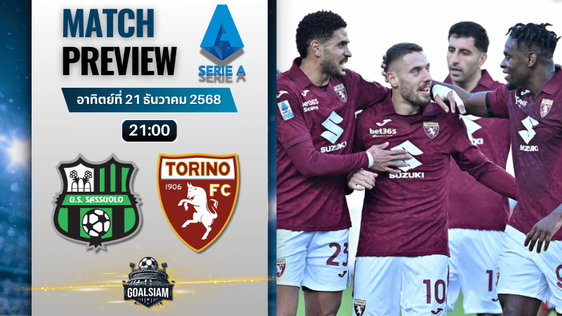 คืนนี้แฟนบอลอิตาลีมีนัดใหญ่กลางตารางที่บอกเลยว่าห้ามกดข้าม วันอาทิตย์ที่ 21 ธันวาคม 2568 เวลา 21:00 น. ซัสเซาโล่เปิดบ้านที่มาเปอิ สเตเดียม เมืองเรจโจ เอมิเลีย รับการมาเยือนของโตริโน่ สองทีมที่ห่างกันแค่ 4 แต้มในตารางคะแนน เซเรียอา ใครหลุดแพ้มีสิทธิ์ไหลลงไปใกล้โซนล่างทันที ฟอร์มช่วงหลังต่างก็มีทั้งหลุดทั้งดี สายลุ้นสกอร์ สายหา ทีเด็ดบอล ต้องชอบแนวเกมแบบนี้แน่นอน ยิ่งเห็นรายชื่อ 11 ตัวจริงจากภาพไลน์อัพแล้ว บอกเลยว่ามีของกันทั้งสองฝั่ง