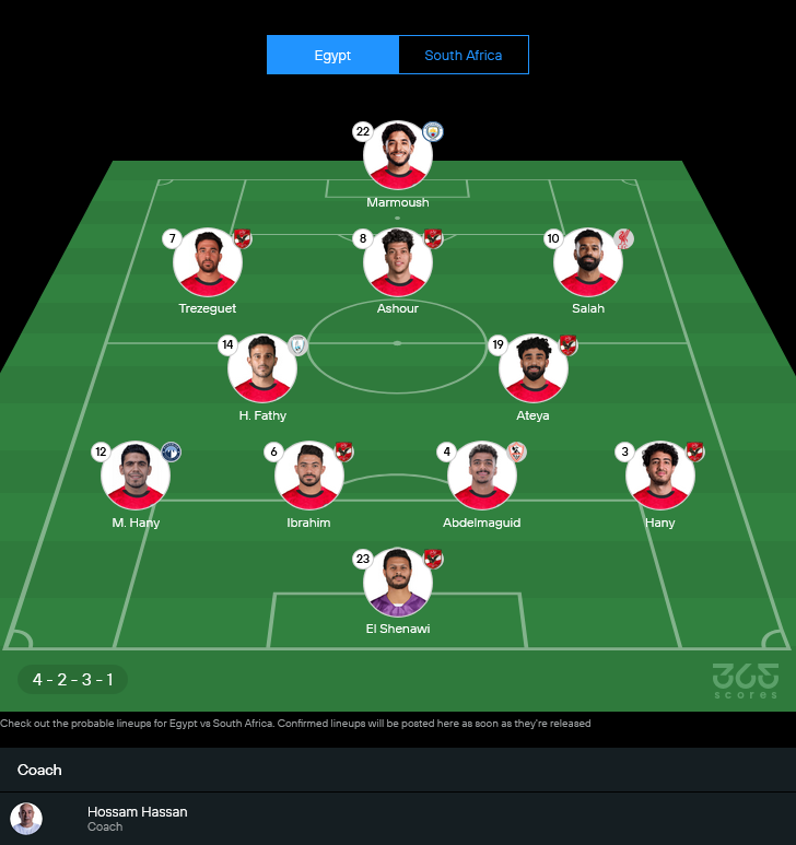อียิปต์ของกุนซือ ฮอสซาม ฮัสซัน น่าจะยึดระบบ 4-2-3-1 ตามเทมเพลตเดิม แผงหลังวาง เอล ชีนาวี เฝ้าเสา คู่เซ็นเตอร์อย่าง อิบราฮิม กับ อับเดลมากุยด์ คอยคุมแดนหลัง ส่วนแบ็กสองข้างใช้ เอ็ม. ฮานี กับ ฮานี เติมเกมรุกตลอด 90 นาที กลางรับวาง ฮาเหม็ด ฟาธี จับคู่ อาเตยา คอยตัดเกมและเชื่อมบอลขึ้นหน้า โดยมีกองกลางตัวรุก อาชูร์ คอยทำเกมอยู่ด้านหลังแนวรุกตัวจี๊ดอย่าง เทรเซเกต์ และ ซาลาห์