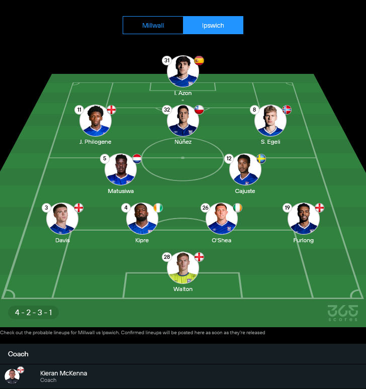 ฝั่งอิปสวิชของ คีแรน แม็กเคนน่า ยังคงรูปแบบ 4-2-3-1 เช่นกัน แดนหน้ามี อิบัน อาซอน รับบทหอกเป้า ด้านหลังมีสามตัวรุกจัดจ้านอย่าง จาดอน ฟิโลจีน, นูเยซ และ เอเกลี ปั่นเกมบุกใส่เจ้าถิ่น คู่กลางใช้ มาทูซิว่า กับ คาจุสเต้ คอยคุมจังหวะ เกมรับฝากความหวังไว้ที่ เดวิส, คิปเร, โอเชีย และ เฟอร์ลองก์ บวกกับ วอลตัน ยืนเฝ้าเสา