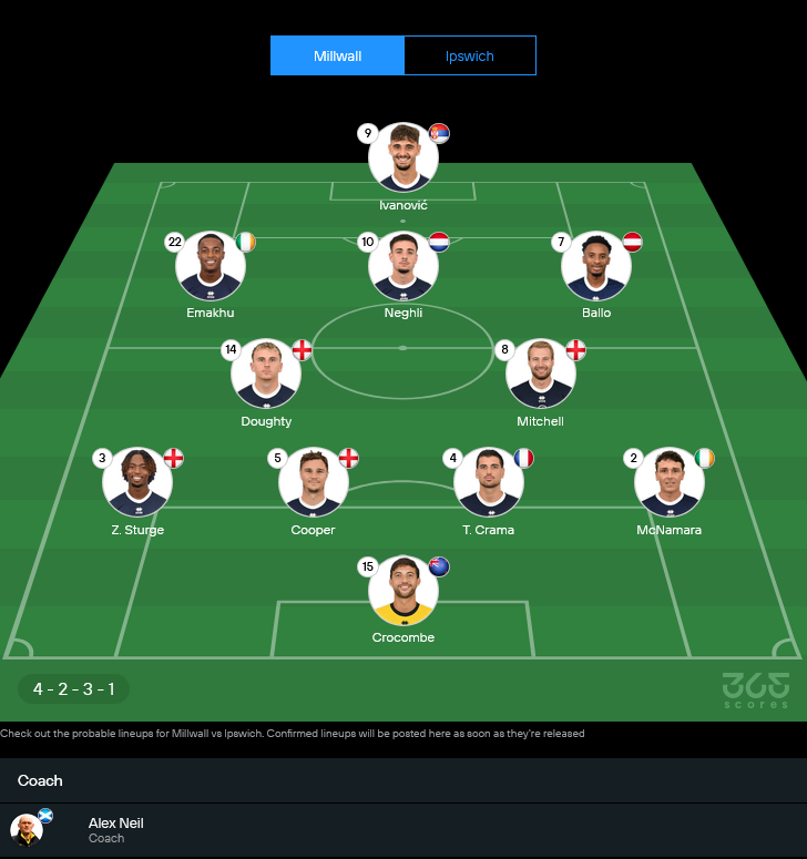 มิลล์วอลล์ของกุนซือ อเล็กซ์ นีล เตรียมจัดทัพในระบบ 4-2-3-1 ตามถนัด แต่ต้องยอมรับว่ามีปัญหาตัวเจ็บเยอะพอสมควร ทั้ง โจชัว โคเบิร์น, ลุค คันเดิ้ล, แคสเปอร์ส เดอ นอร์เร่, ลูคัส เยนเซ่น, มาสซิโม่ ลูอองโก้, เดเร็ค มาซู-แซ็กโก้ และ วิลเลี่ยม สมอลล์โบน ยังไม่พร้อมลงสนาม ทำให้ขุมกำลังต้องพึ่งแกนหลักที่เหลือแบบเต็มสูบ