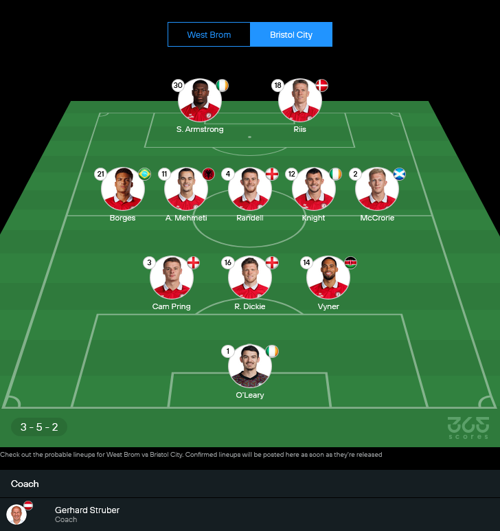 ฝั่ง บริสตอล ซิตี้ ของ เกอร์ฮาร์ด สตรูเบอร์ สภาพทีมดีกว่าเล็กน้อย แต่ก็มีปัญหาเรื่องความฟิตของแนวรุกบางคน โดยเฉพาะ อานิส เมห์เมติ ที่เพิ่งหายป่วย ส่วน โรบินส์ยังต้องคุมโหลด โรบ แอตกินสัน ที่มีอาการเจ็บเรื้อรังเล็กๆ ทำให้โค้ชอาจเลือกใช้เขาเป็นทีเด็ดลงมาช่วงท้ายมากกว่าจะยัดตัวจริง
