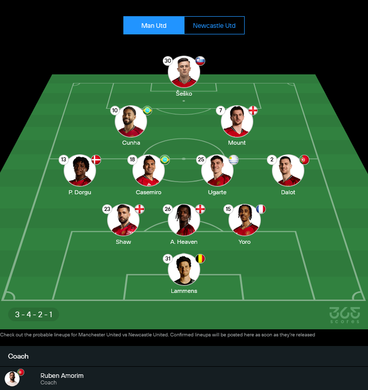 คาดว่ารูปแบบจะใช้เซนเน่ ลัมเมนส์ เฝ้าเสา สามเซ็นเตอร์เป็น เลนี โยโร่, อายเดน เฮเว่น และ ลุค ชอว์ วิงแบ็กขวา ดิโอโก้ ดาโลต์ ฝั่งซ้ายใช้ พาทริค ดอร์กู แดนกลางวาง มานูเอล อูการ์เต้ คู่กับ คาเซมิโร่ ส่วนสองตัวรุกด้านหลังหน้าเป้าเป็น มาเธอุส คุนญ่า กับ เมสัน เม้าต์ ปั้นเกมให้ เบนจามิน เซสโก้ ยืนหอกตัวจบ