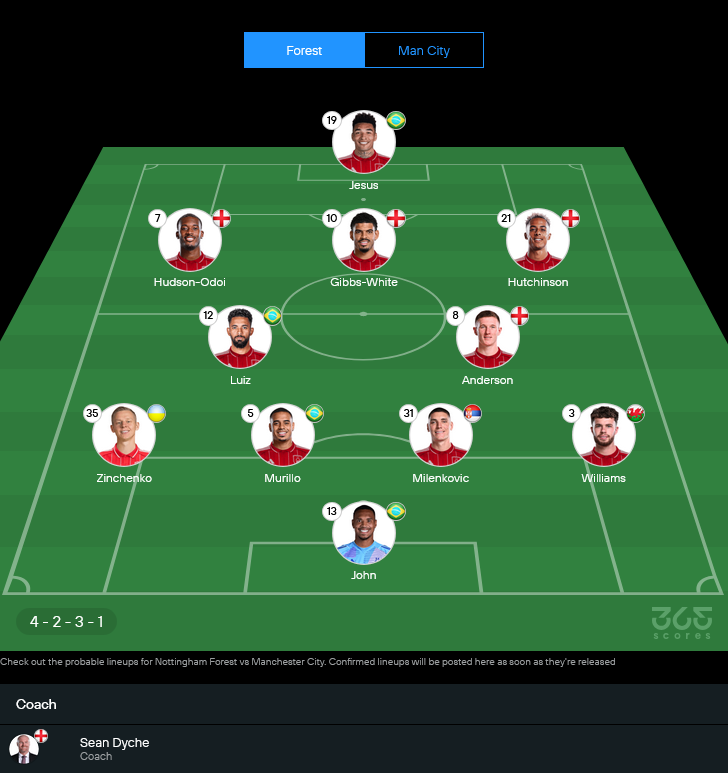 ฟอเรสต์ของกุนซือฌอน ไดช์ยังมีปัญหาตัวเจ็บเพียบ ทั้งไรอัน เยตส์, โอลา ไอน่า, คริส วู้ด, วิลลี่ โบลี่, อิบราฮิม ซ็องกาเร่ และ ดาน เอ็นดอย ที่ต้องนั่งดูเพื่อนจากข้างสนาม ทำให้ตัวเลือกในแนวรับกับกลางรับบางลงพอสมควร ดีที่แกนหลักที่เหลือยังยืนกันครบ คาดว่าไดช์จะจัดแผน 4-2-3-1 เน้นเกมรับแน่นแล้วค่อยสวนกลับด้วยความเร็วของตัวริมเส้น