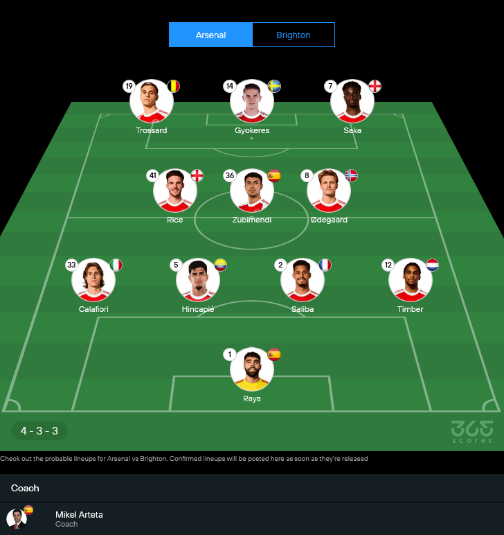 อาร์เตต้าน่าจะจัดระบบ 4-3-3 เล่นบอลครองพื้นที่กลางสนามให้แน่น ใช้ความเข้าใจเกมของซูบิเมนดี้กับดีแคลน ไรซ์ คอยตัดเกมตรงกลาง เปิดทางให้มาร์ติน โอเดการ์ดเชื่อมกับสามแนวรุกอย่างทรอสซาร์ด, วิคตอร์ โยเคเรส และบูกาโย่ ซาก้า ไล่กดดันแนวรับทีมเยือนแบบไม่ให้พักหายใจ ถือเป็นรูปแบบการเล่นที่เข้ากับสไตล์เน้นต่อบอลเท้าสู่เท้าของทีมอย่างลงตัวมากๆ และยังตอบโจทย์สายชอบอ่านเกมแนว วิเคราะห์บอล ลึกๆ ด้วย