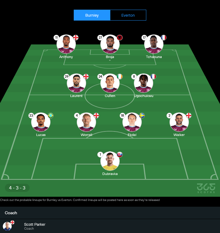 มอยส์น่าจะจัด 4-2-3-1 ลงสู้ ใช้ แบร์รี่ ยืนหน้าเป้า โดยมี อัลการาซ ปั้นเกมตรงกลาง และแม็กนีลกับกรีลิชคอยลากเลื้อยด้านข้าง รูปแบบเกมน่าจะเป็นเอฟเวอร์ตันครองบอลมากกว่า แล้วหาจังหวะบอมบ์ใส่แนวรับเบิร์นลี่ย์ที่หลวมเป็นทุนเดิมอยู่แล้ว