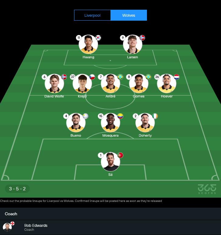 วูล์ฟส์ของ ร็อบ เอ็ดเวิร์ดส์ สภาพทีมไม่ดีเช่นกัน ตัวเจ็บยาวเป็นหางว่าว ทั้ง มาร์แชลล์ มูเน็ตซี่, ฌ็อง-ริกแนร์ เบลล์การ์ด, แดเนี่ยล เบนต์ลี่ย์, โตติ โกเมส, โรดริโก้ โกเมส, เอ็มมานูเอล อั๊กบาดู, ตาวานด้า ชิเรว่า แถม อูโก้ บูเอโน่ ยังต้องเช็กฟิตอีกหนึ่งราย ทำให้ตัวเลือกแนวรับและมิดฟิลด์กลางสนามบางลงอย่างเห็นได้ชัด