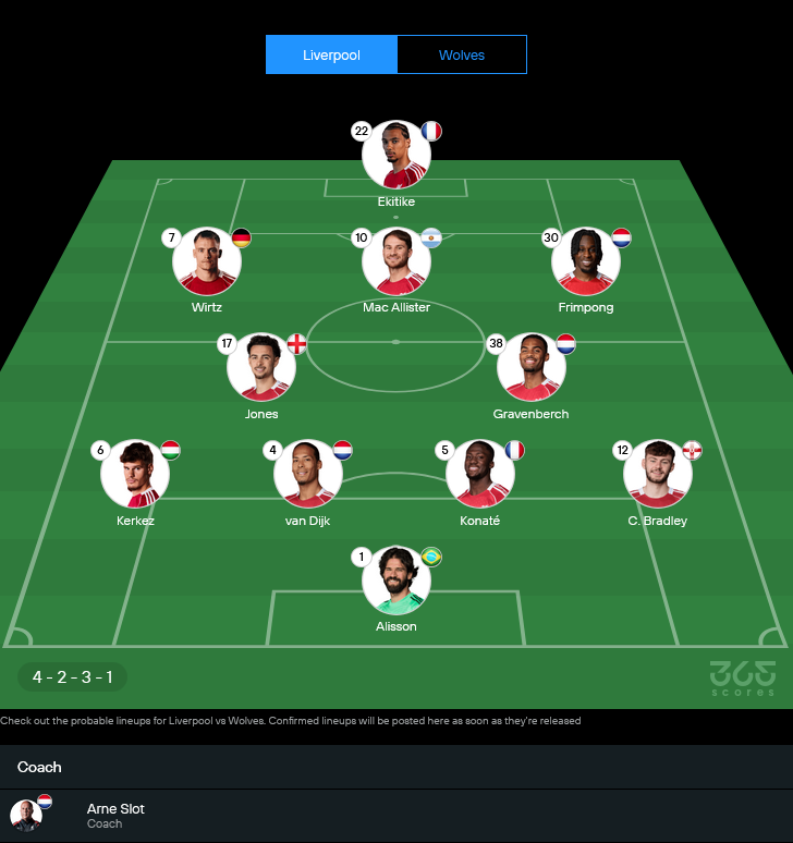 ดูภาพรวมแล้วคู่นี้เหมือนบอลคนละเกรดจริงๆ ลิเวอร์พูลกำลังมาแรง ทั้งฟอร์มและความมั่นใจในห้องแต่งตัว นักเตะรุ่นใหม่เริ่มคลิกกันมากขึ้น เกมรุกมีลูกเข้าทำหลากหลาย ตั้งแต่ต่อบอลสั้นทะลุช่อง ไปจนถึงโยนเปิดจากริมเส้นให้ เอกิติเก้ โฉบโขก ขณะที่ วูล์ฟส์ นอกจากฟอร์มจะแผ่วแล้ว ขุมกำลังก็ไม่สมบูรณ์ ตัวเจ็บยาวตรึม ทำให้ตัวเลือกโรเตชั่นแทบไม่มี