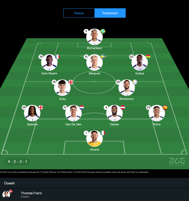 อย่างไรก็ดี แฟร้งค์ยังยึดระบบ 4-2-3-1 ซึ่งเหมาะกับทรงบอลบุกของทีม ผู้รักษาประตูใช้ กูเญลโม่ วิคาริโอ เฝ้าเสา แผงหลังสี่คนวาง เจด สเปนซ์, มิกกี้ ฟาน เดอ เวน, เควิน ดันโซ และ เปโดร ปอร์โร่ กลางคู่ใช้ โรดริโก้ เบนตานกูร์ ประคองดาวรุ่งอย่าง อาร์ชี่ เกรย์ แนวรุกสามตัวด้านหลังหน้าเป้า จัด โมฮัมเหม็ด คูดุส, ลูคัส เบิร์กวัลล์, ร็องดาล โกโล มูอานี่ ปั้นเกมให้ ริชาร์ลิซอน ยืนห้อยเป็นตัวจบสกอร์