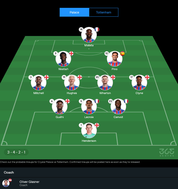 คาดว่า พาเลซจะลงเล่นในระบบ 3-4-2-1 เพื่อเน้นเกมโต้กลับและปิดพื้นที่แดนกลาง แกนหลักอย่าง ดีนนี่ เฮนเดอร์สัน ยืนเฝ้าเสา สามเซ็นเตอร์ใช้ มาร์ก เกอี, มักซ็องซ์ ลาครัวซ์ และ เจย์ดี ก็องโวต์ วิงแบ็กสองฝั่งเป็น ไทริค มิตเชลล์ กับ นาธาเนี่ยล ไคลน์ กลางคู่ใช้ อดัม วาร์ตัน จับคู่กับ วิลล์ ฮิวจ์ส ส่วนแนวรุกวาง เยเรมี่ ปิโน่ กับ เอ็ดดี้ เอ็นเคเตียห์ ปั้นเกมหลังหน้าเป้า ฌ็อง-ฟิลิปเป้ มาเตต้า หากเช็กฟิตผ่าน