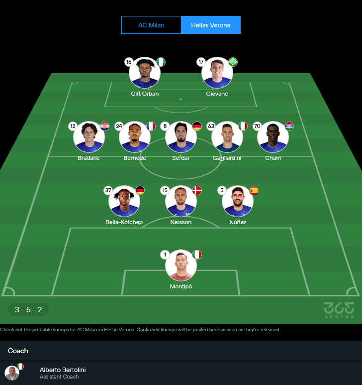 ฝั่งทีมเยือนของกุนซือ เปาโล ซาเน็ตติ ความมั่นใจมาเต็ม แต่สภาพทีมยังมีปัญหาเหมือนกัน เกมนี้ไม่มีชื่อ มาร์ติน เฟรเซ ที่ติดโทษแบน แถม ราฟิก เบลกาลี ยังไม่พร้อมทั้งจากภารกิจทีมชาติและโดนแบนสะสมใบเหลือง ส่วนแข้งเดี้ยงยาว ได้แก่ โดมากอย บราดาริช, โตมาส ซุสลอฟ และ ฌอง-ดาเนี่ยล อัคปา-อัคโปร อย่างไรก็ดี แกนหลักชุดที่กำลังร้อนแรงยังอยู่ครบ โดยซาเน็ตติจะวางหมากในระบบ 3-5-2 เน้นแนวรับสามเซนเตอร์ที่แข็งโป๊ก แล้วให้คู่หน้ากดดันแนวรับมิลานแบบไม่ให้ตั้งลำ
