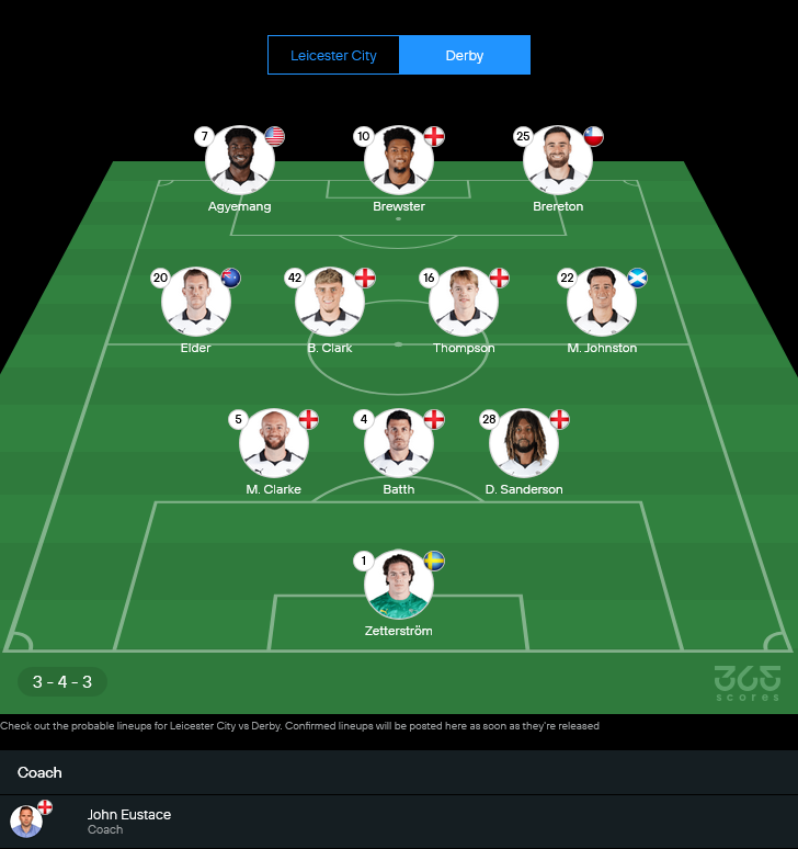 ทีมเยือนของกุนซือ จอห์น ยูสตาซ์ วางหมากมาแบบระวังตัวใช้ระบบ 3-4-3 เน้นเกมรับแน่นก่อนแล้วค่อยหาจังหวะสวนกลับ ใจกลางแนวรับมีสามเซ็นเตอร์คอยเก็บบอลกลางอากาศ ส่วนด้านหน้ามีตัววิ่งเร็วพร้อมฉกฉวยโอกาส ถ้าเกมนี้ดาร์บี้รับแน่นๆ แล้วรอจังหวะเลสเตอร์หลุด แฟนเจ้าบ้านก็มีโอกาสลุ้นเหงื่อตกเหมือนกัน