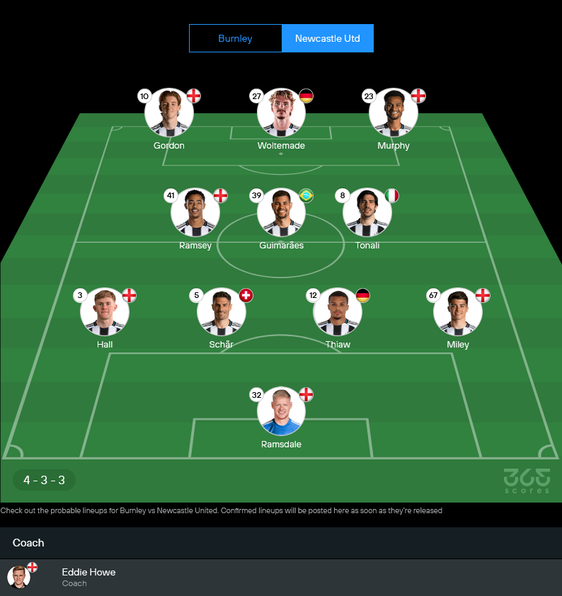 แม้จะขาดหลายคน แต่นิวคาสเซิ่ลยังจัดทีมในระบบ 4-3-3 ที่เล่นกันค่อนข้างลงตัว มี อารอน แรมสเดล ยืนเฝ้าเสา แผงหลังใช้ ลูอิส ฮอลล์, ฟาเบียน ชาร์, มาลิค เธียว และ ลูอิส ไมลี่ย์ ช่วยกันคุมพื้นที่ ส่วนกลางสนามปล่อยให้ บรูโน่ กีมาไรส์ เดินเกมร่วมกับ ซานโดร โตนาลี่ และ จาค็อบ แรมซี่ย์ สามประสานแนวรุกเป็น แอนโธนี่ กอร์ดอน, นิค โวลเทอมาด้า และ เจค็อบ เมอร์ฟี่ ที่สปีดจัดจ้านทุกคน